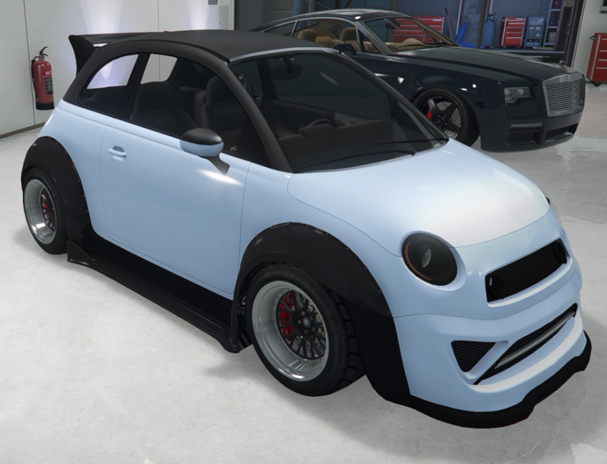 The design of the Grotti Brioso R/A is based on a real life Fiat 500; 595 Abarth, Mini John Works Cooper WRC, Suzuki Swift, Nissan Micra.
