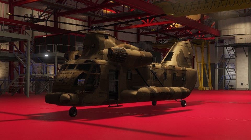 The Cargobob is stored as a Pegasus Vehicle or in the Hangar (Personal Aircraft). It can only be resprayed and cannot be further modified.